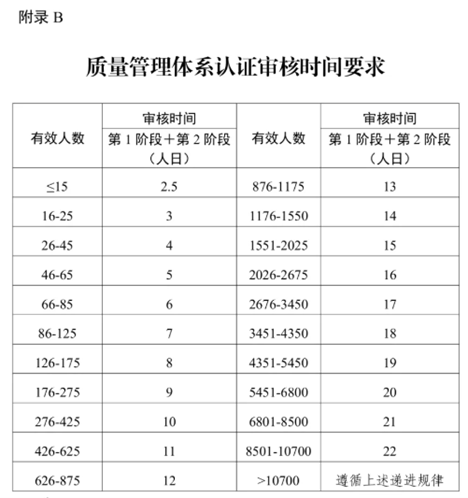 比较旧版规则审核时间,企业有效人数在15人及以下,分为3档,第一档(1-5人)初审审核时间只有1.5人日,第二档(6-10人)初审审核时间只有2.0人日,第三档(10-15人)初审审核时间2.5人日。新版规则中企业有效人数小于或等于15人,初审(第一阶段和第二阶段)的审核时间统一为2.5人日。