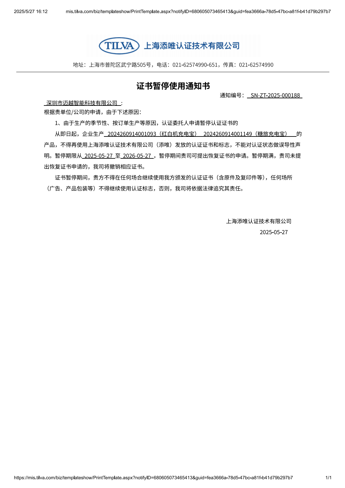 证书暂停使用通知书-深圳市迈越智能科技有限公司