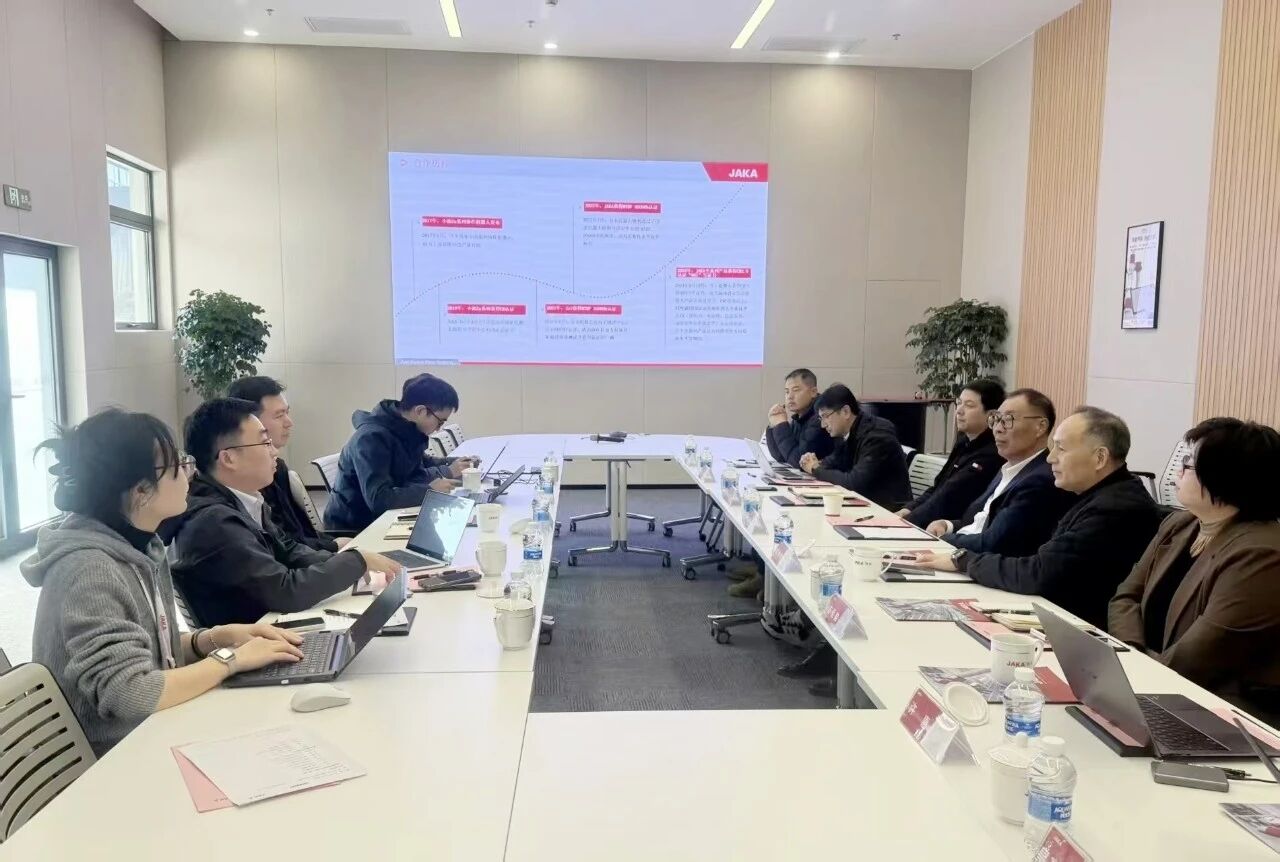 会议伊始,在李明洋董事长的带领下,上电科一行参观了节卡机器人展厅及测试区域。现场不仅展示了 JAKA 全系列产品的核心技术与应用场景,还系统回顾了双方过往的合作历程,为后续深化合作奠定了坚实基础。