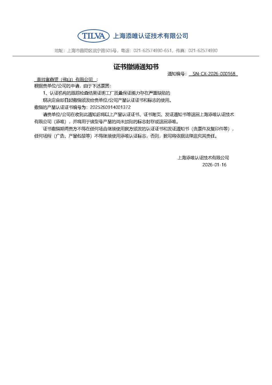 证书撤销通知书-高帅富商贸(佛山)有限公司