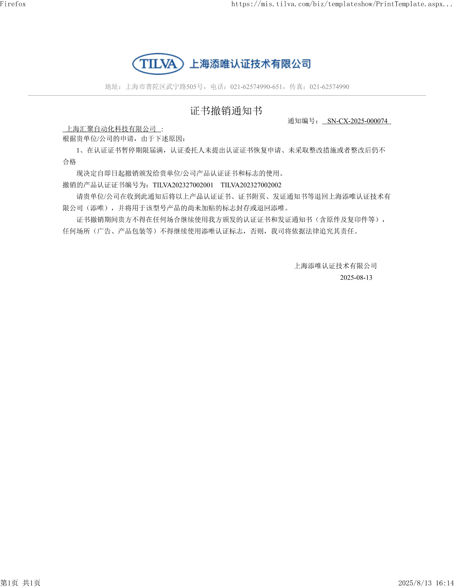 证书撤销通知书-上海汇聚自动化科技有限公司