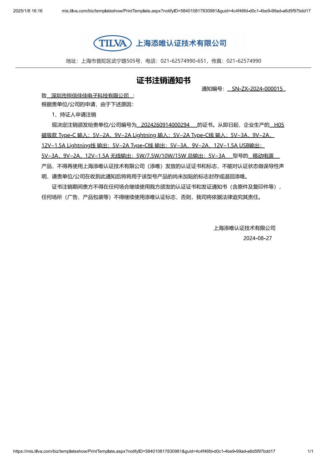 证书注销通知书-深圳市恒信佳佳电子科技有限公司